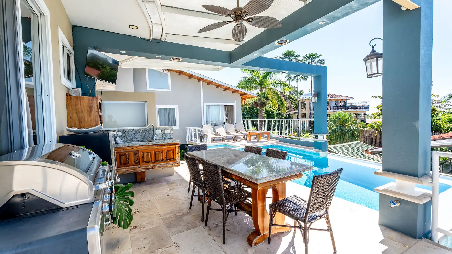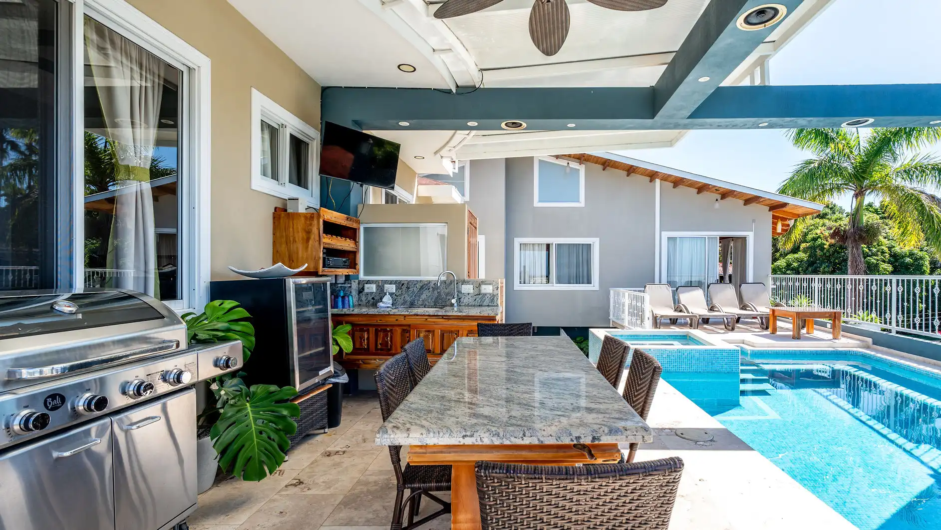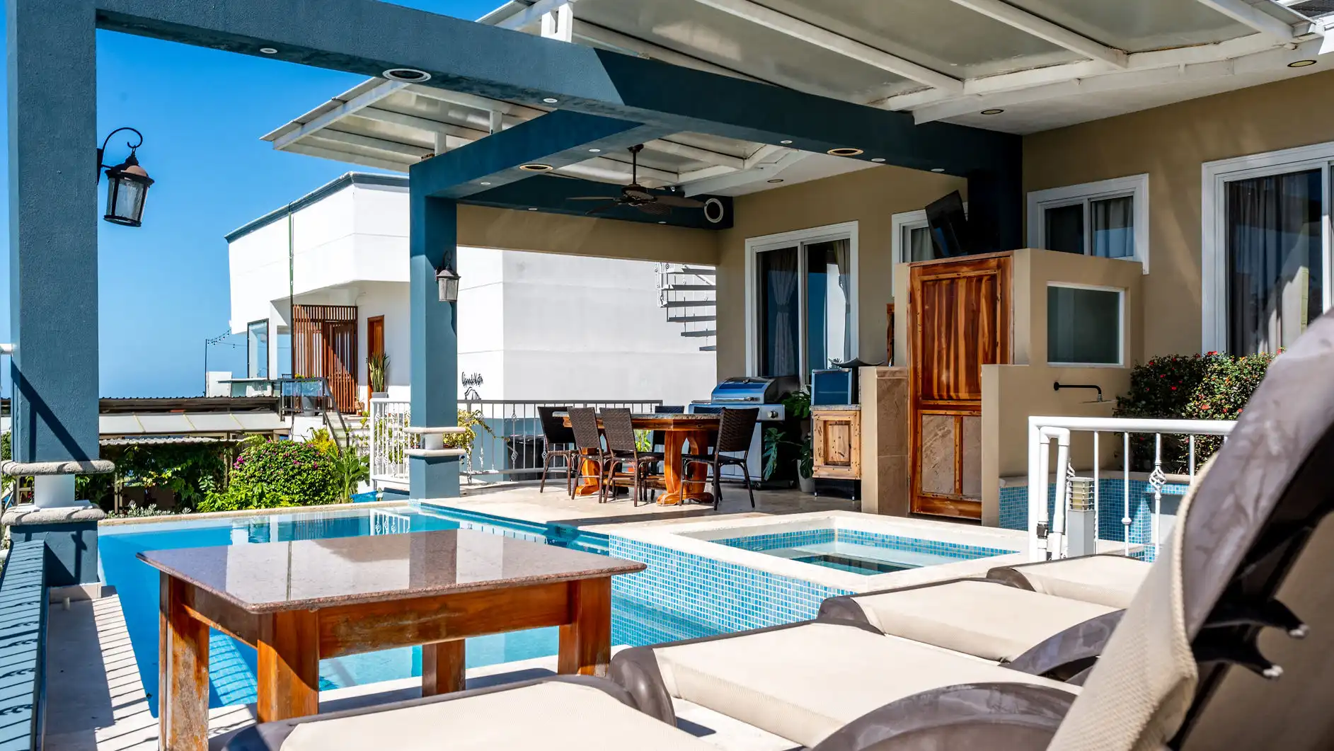 Tucked within a secure gated estate, Casa Alta Vista shares the grounds with another private rental villa (available for larger groups) and the owner’s residence. Guests benefit from nightly security, ensuring a peaceful and worry-free stay. A special perk? Exclusive VIP discounts on food and drinks at one of the area’s top grocery stores, owned by the villa’s proprietor. Designed to embrace seamless indoor-outdoor living, this home offers an unparalleled setting for relaxation and entertainment.