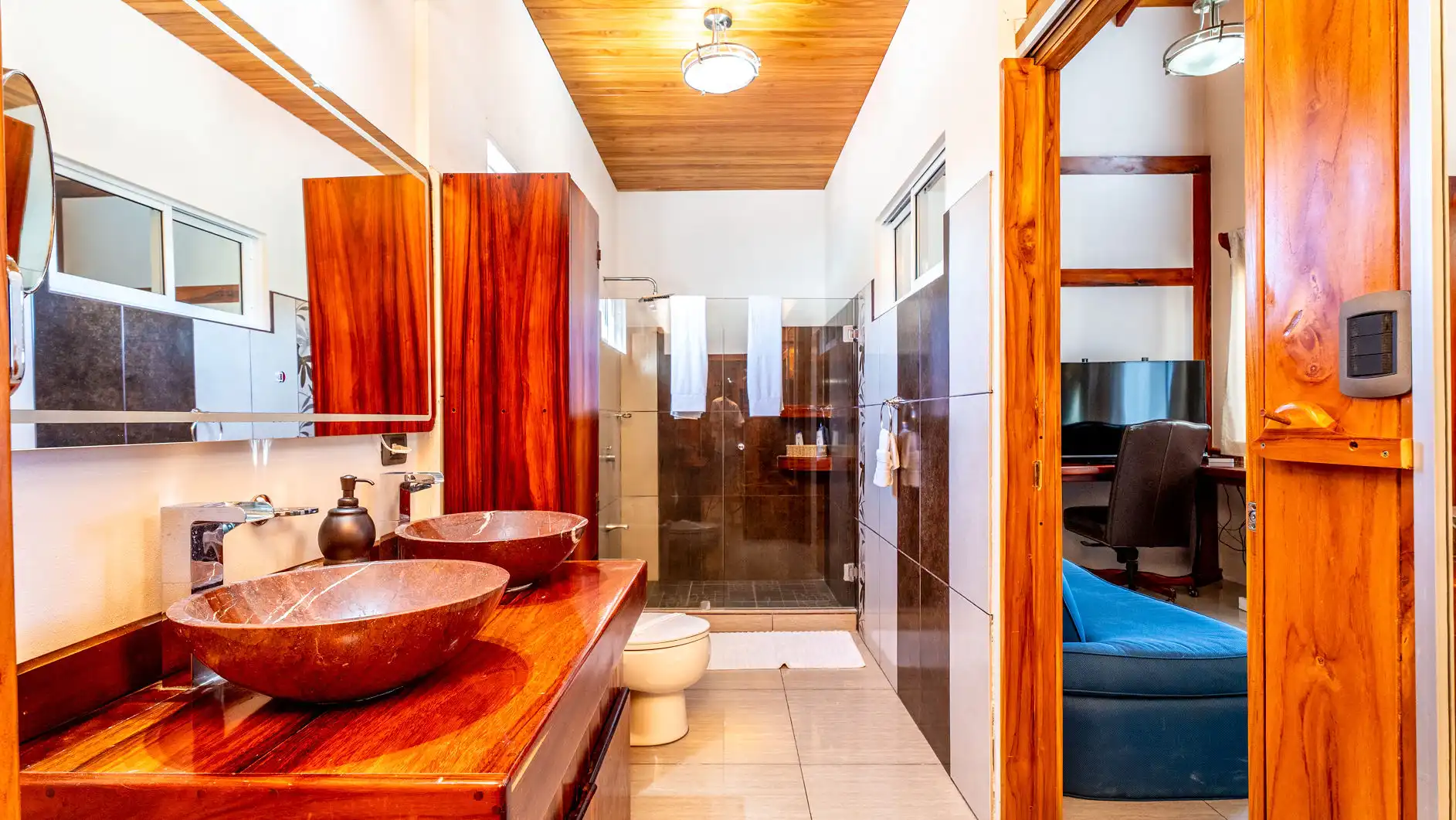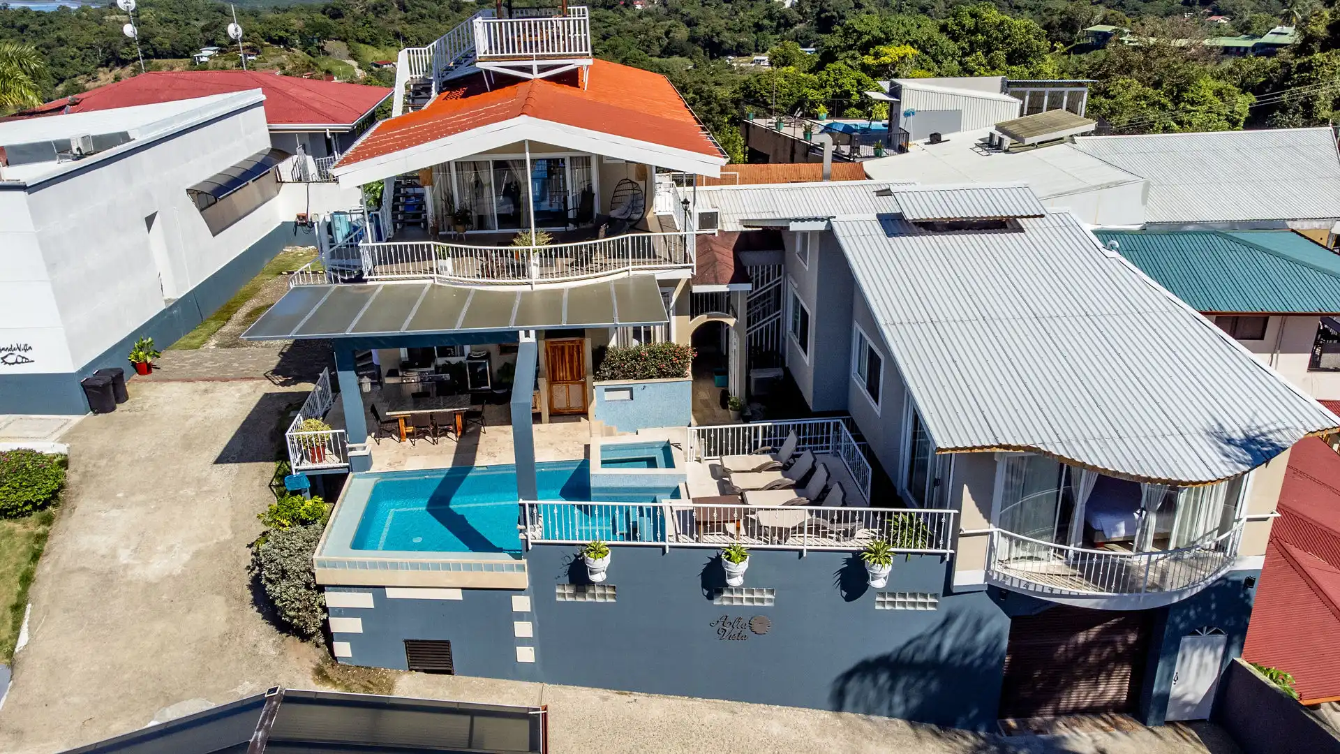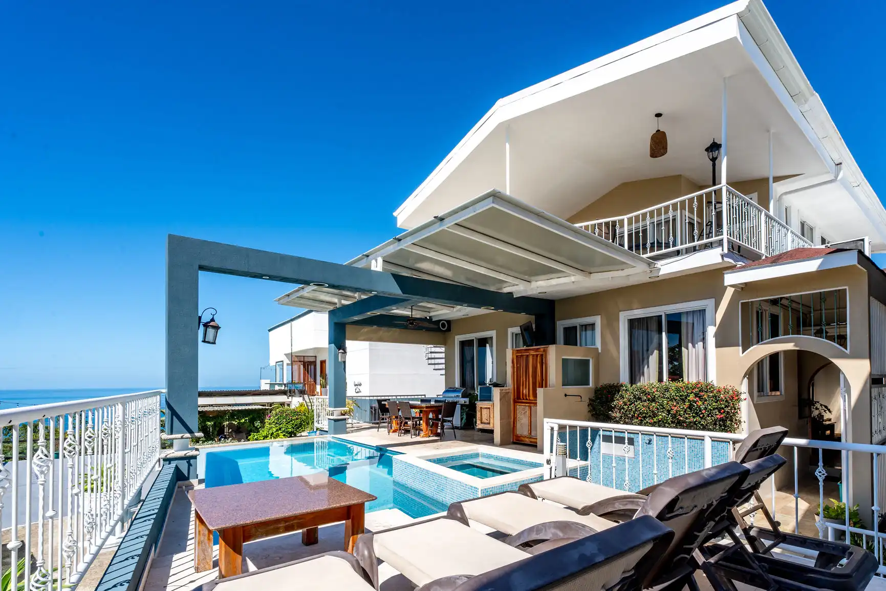 Spanning three spacious levels, the villa features six luxurious bedrooms, four full bathrooms, and two half baths—perfect for families, groups, or special occasions. The fully-equipped gourmet kitchen opens onto a stunning outdoor lounge, infinity pool, and grill area, making it effortless to enjoy meals with a view. Take a dip in the solar-filtered infinity pool, unwind in the Jacuzzi, or soak up the tropical ambiance from the Mirador, offering one of the most spectacular sunset views in Costa Rica.