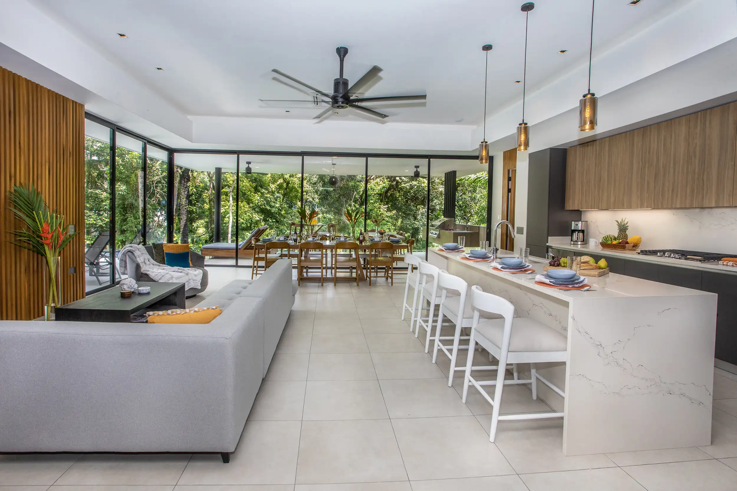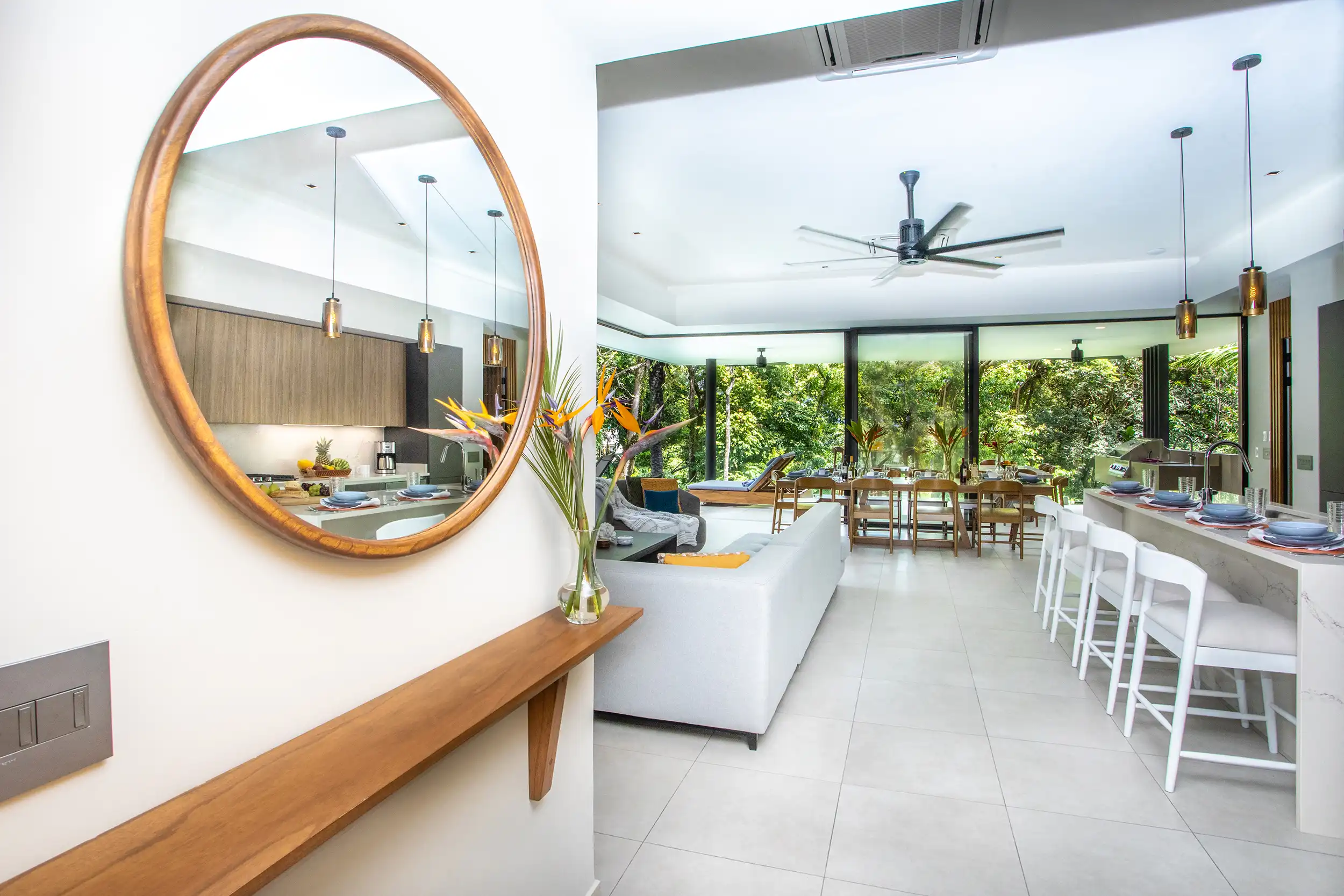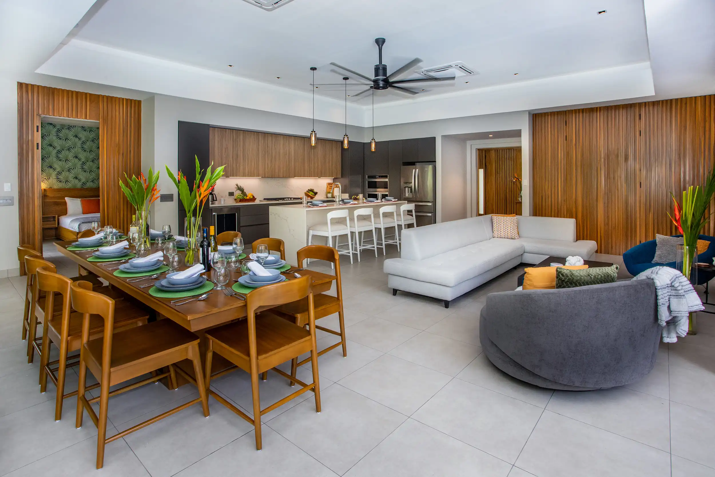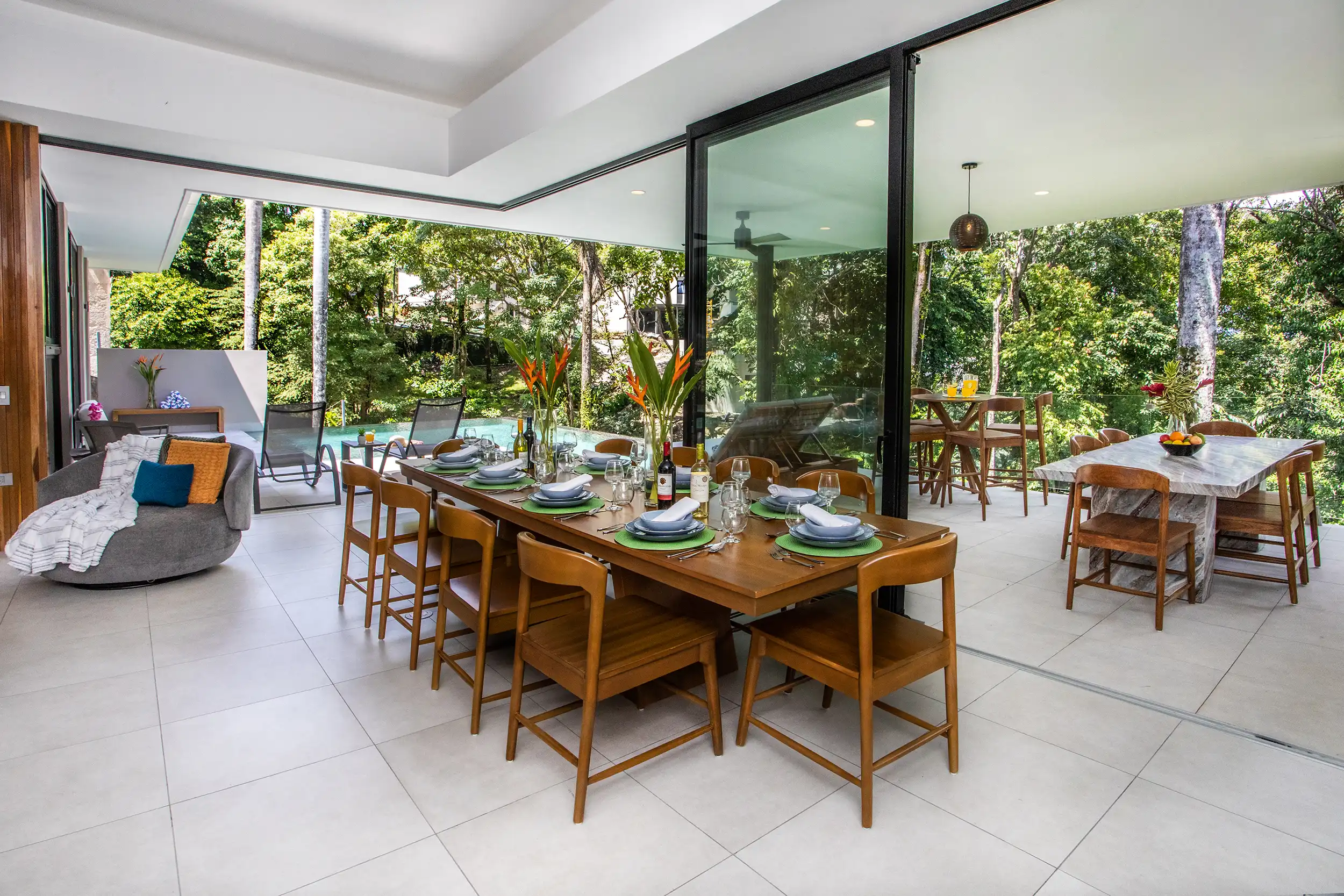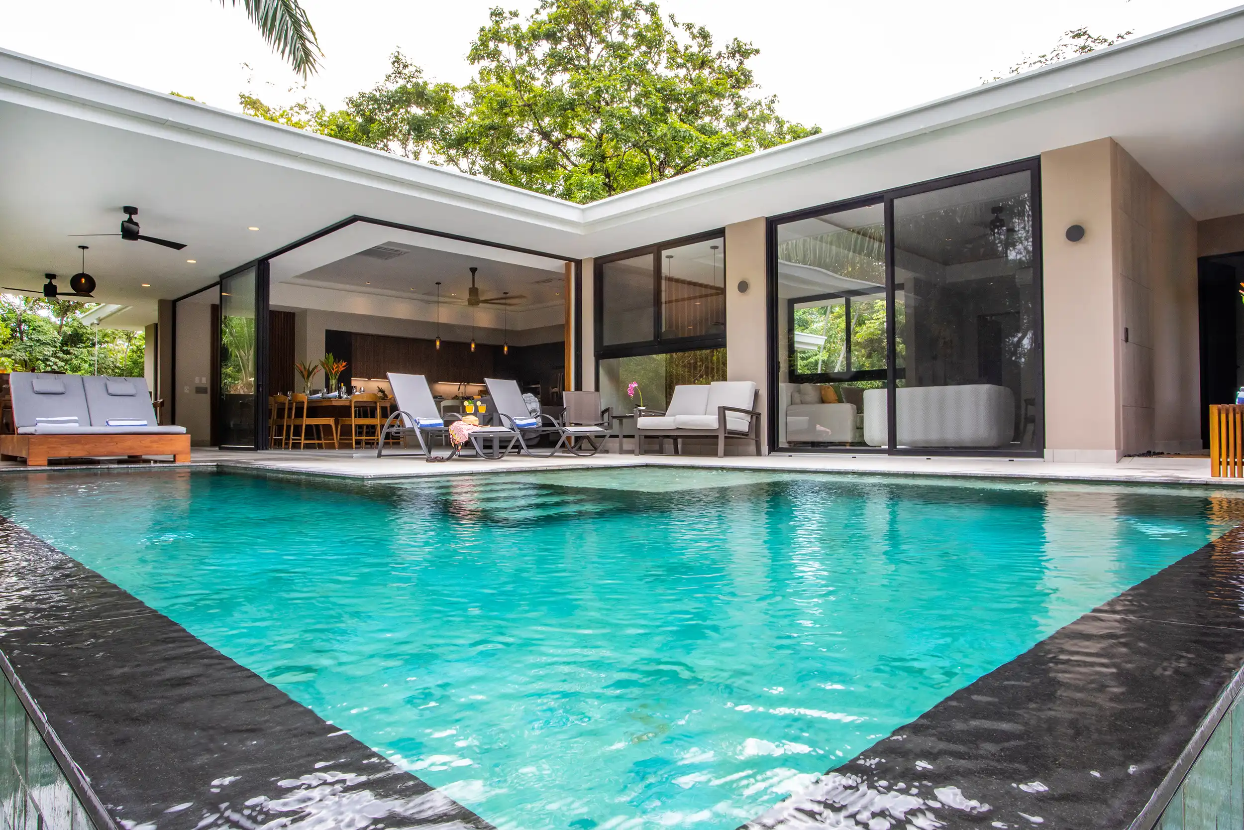 Built to embrace seamless indoor-outdoor living, Casa Dos Hermanas features soaring ceilings, expansive windows, and open-concept social spaces, allowing guests to feel fully connected to the tropical surroundings. The gourmet kitchen and spacious dining area are perfect for hosting memorable meals, whether you’re preparing a home-cooked feast or indulging in a private chef experience arranged by your concierge.